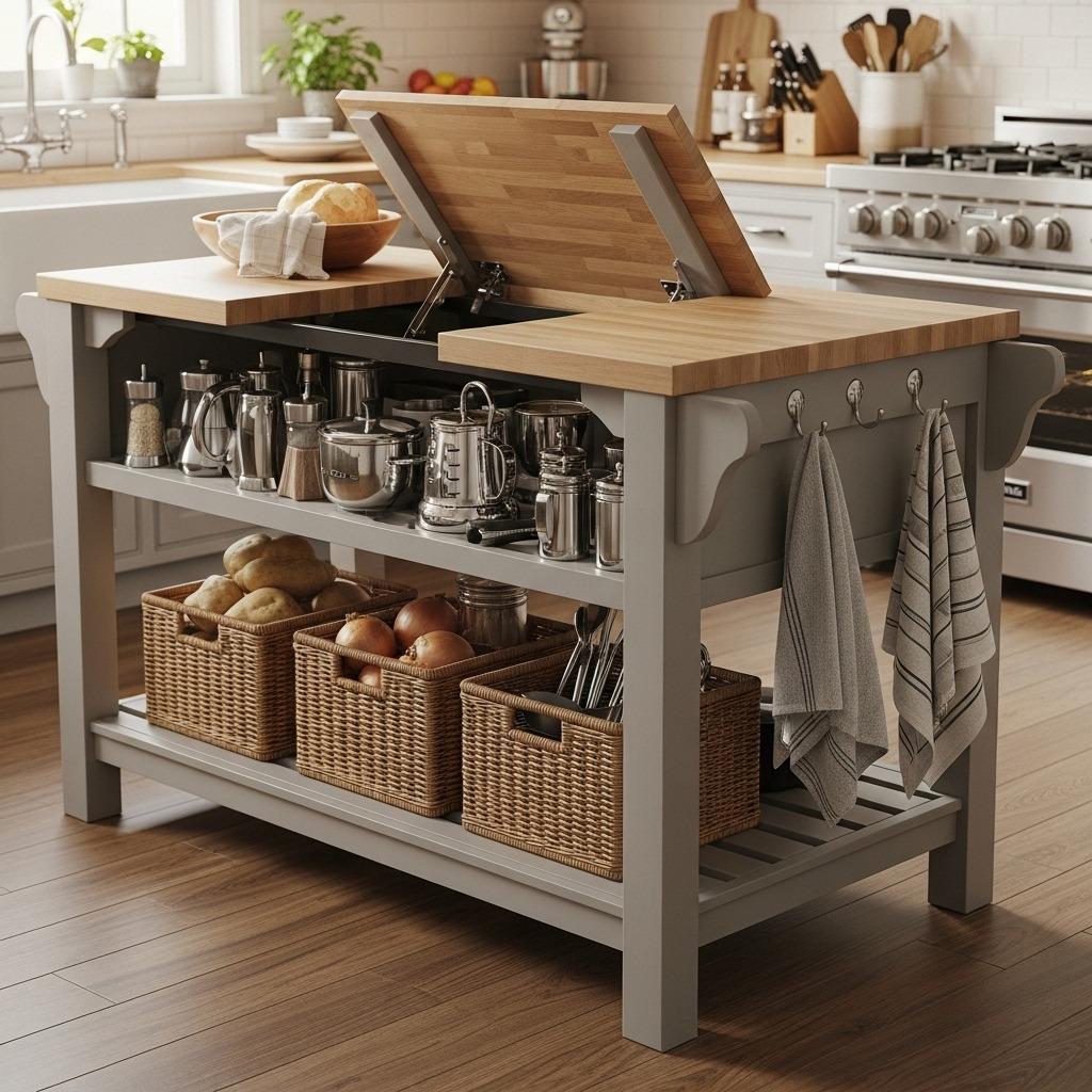Fixed islands eat floor space but don’t always justify their footprint. Convertible versions earn their keep through multiple storage features built into a single piece of furniture. Look for islands with butcher block tops that provide extra prep space, hooks on the ends for hanging towels or oven mitts, and open shelving or closed cabinets below.