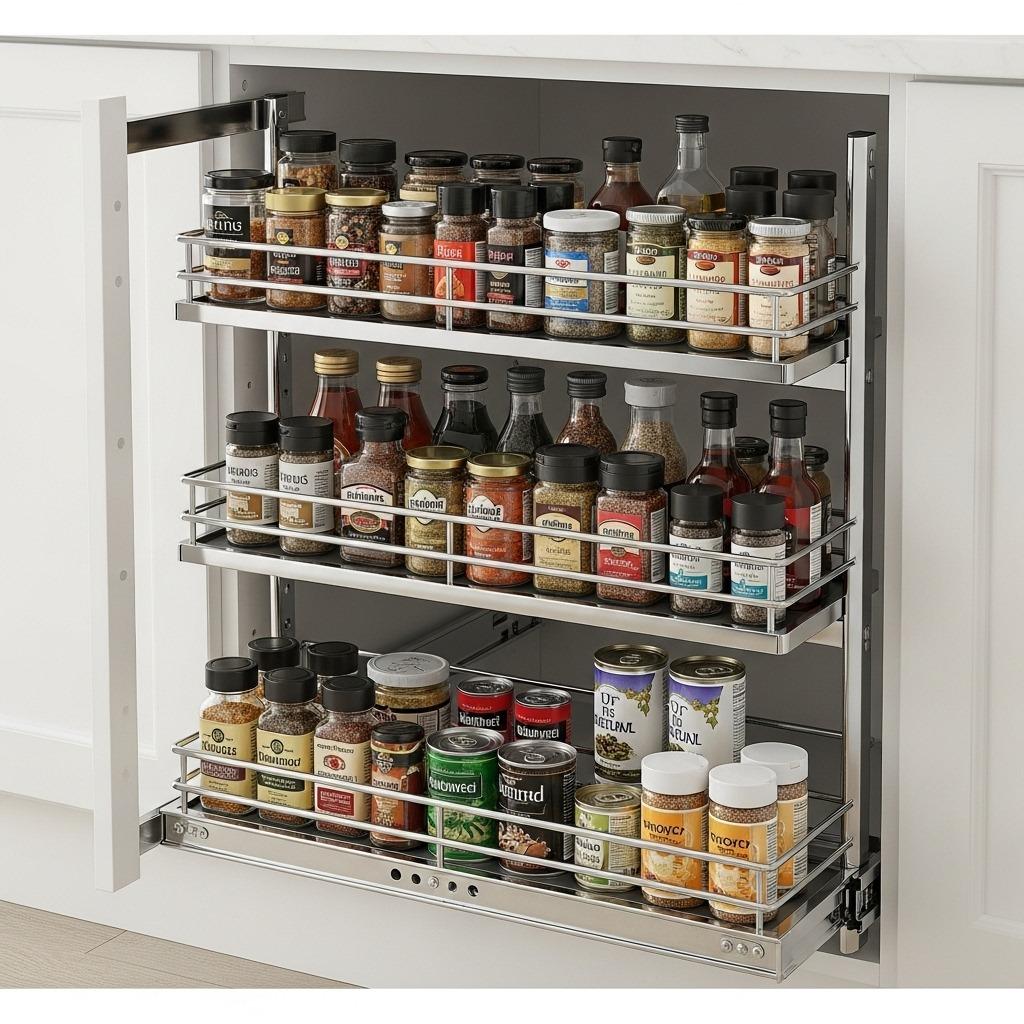 These sliding systems come in various widths to fit different cabinet sizes. Narrow pull-outs (6-9 inches) fit beside your refrigerator or stove and work perfectly for spices, oils, and vinegars. Wider versions (12-18 inches) handle canned goods, small appliances, or cleaning supplies. The key is choosing organizers with multiple tiers so you’re using vertical space efficiently.