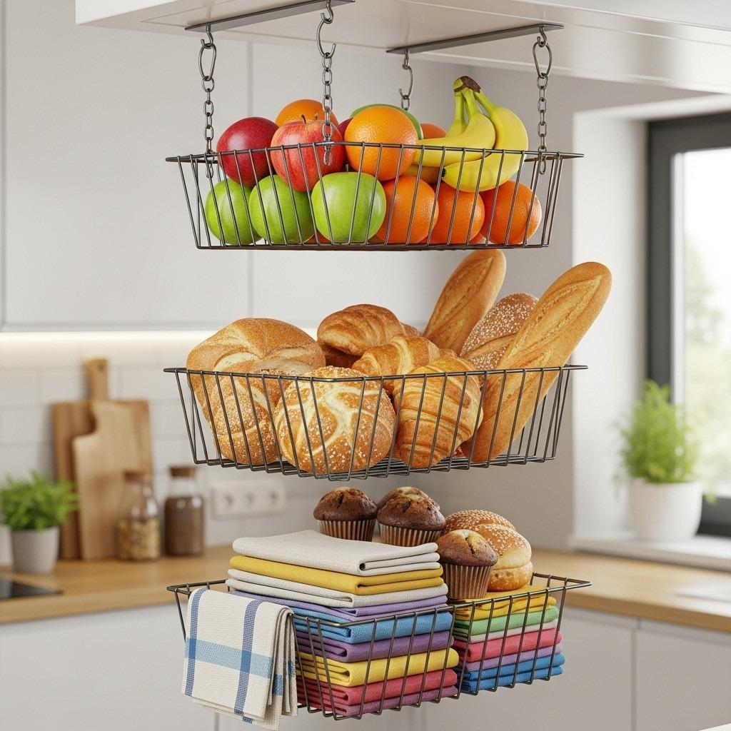 Wire baskets work best because air circulation prevents produce from spoiling too quickly. Use the top basket for items you grab less frequently – maybe backup dish towels or specialty baking ingredients. Middle baskets hold fruits that ripen better at room temperature. Bottom baskets keep frequently used items like onions, garlic, or bread within easy reach.