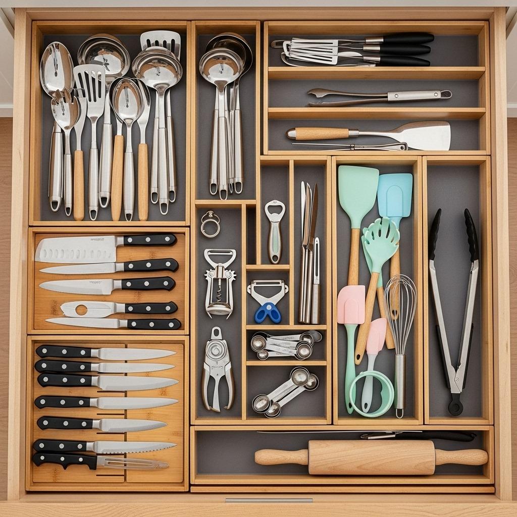 Start by grouping similar items – all whisks together, all spatulas together, all measuring spoons together. Then adjust dividers to fit each group snugly. This prevents the annoying drift where utensils migrate into neighboring sections every time you open and close the drawer. The tighter organization also lets you see at a glance when you’re running low on something.
