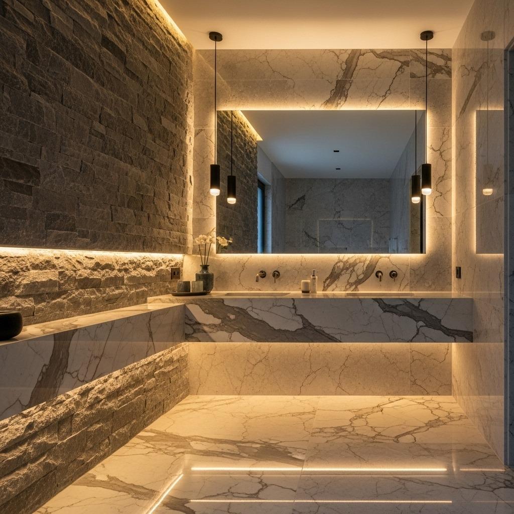 Layer different light sources rather than relying on single overhead fixtures. Task lighting at your vanity, ambient lighting for overall illumination, and accent lighting for stone features creates depth and functionality. This approach, commonly used in bathroom ideas, ensures your space works at any time of day.