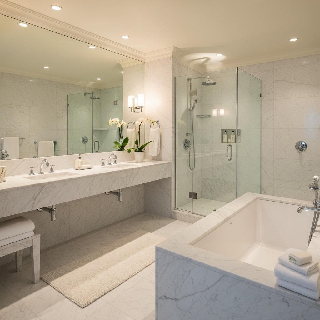 Consider where marble makes the biggest visual impact. Floor-to-ceiling marble in a shower creates that five-star hotel feeling, especially when you choose large format tiles that minimize grout lines. A marble vanity top paired with simpler wall treatments gives you luxury without the full renovation budget.