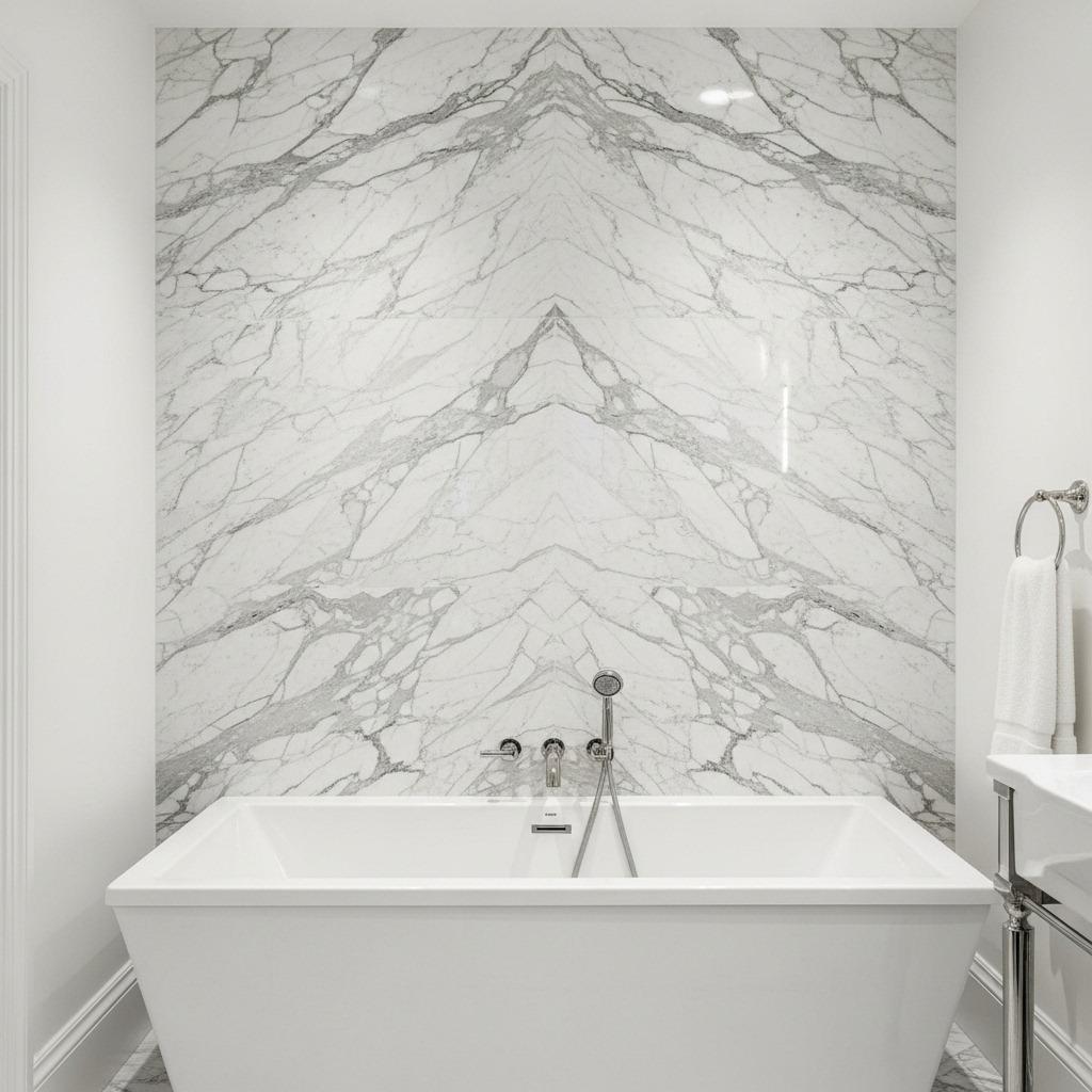 Book-matched slabs create jaw-dropping symmetry by mirroring stone veining. It’s a technique straight from high-end design that instantly elevates your space. Position this behind a freestanding tub or vanity where it becomes the focal point – everything else can remain simple to let the stone shine.