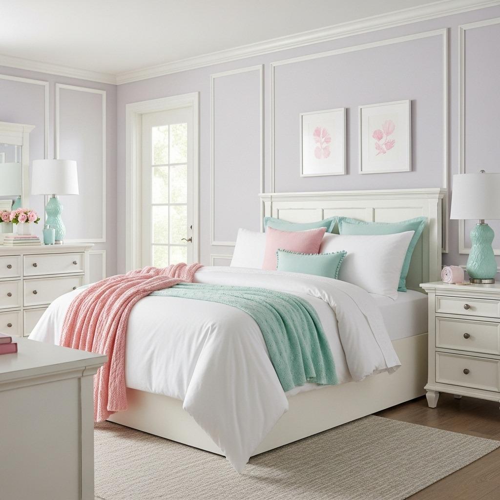 White bedding as a base layer lets you play with pastel accents on top. Crisp white sheets under a pastel duvet feel hotel-luxe and are easy to wash. White also reflects light beautifully, keeping your bedroom feeling bright and airy.