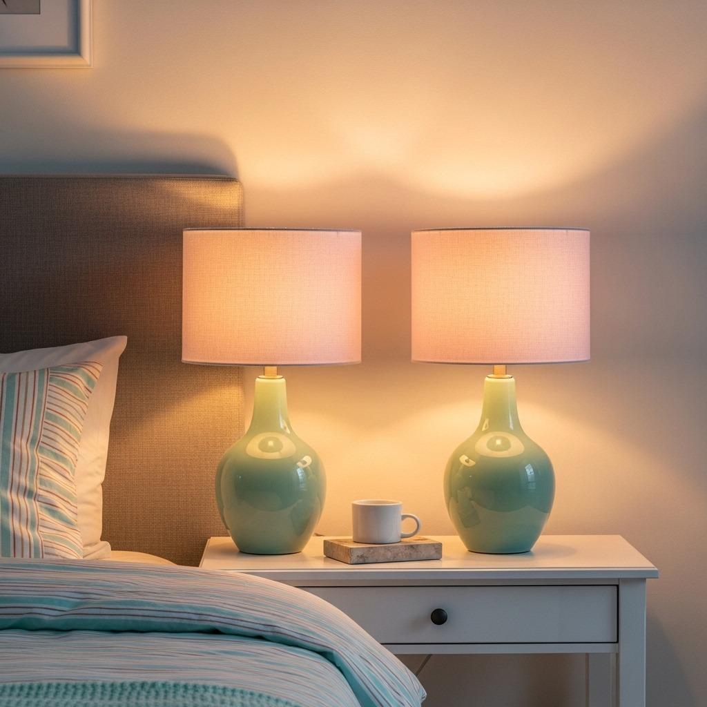 Ceramic or glass lamp bases in pastel tones paired with white or cream shades offer another styling option. This combination is slightly more subtle – you get the pop of color from the base, but the light itself remains neutral. This works well if you’re using multiple light sources and want more control over the light color.