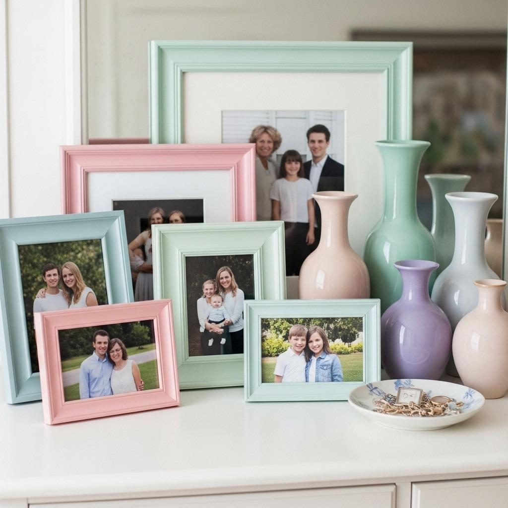 Family photos in pastel-toned frames or with soft-filtered editing create a gallery that’s cohesive with your color scheme. Black and white photos in pastel frames work beautifully too. Display these on walls, shelves, or dresser tops where you’ll see them daily.