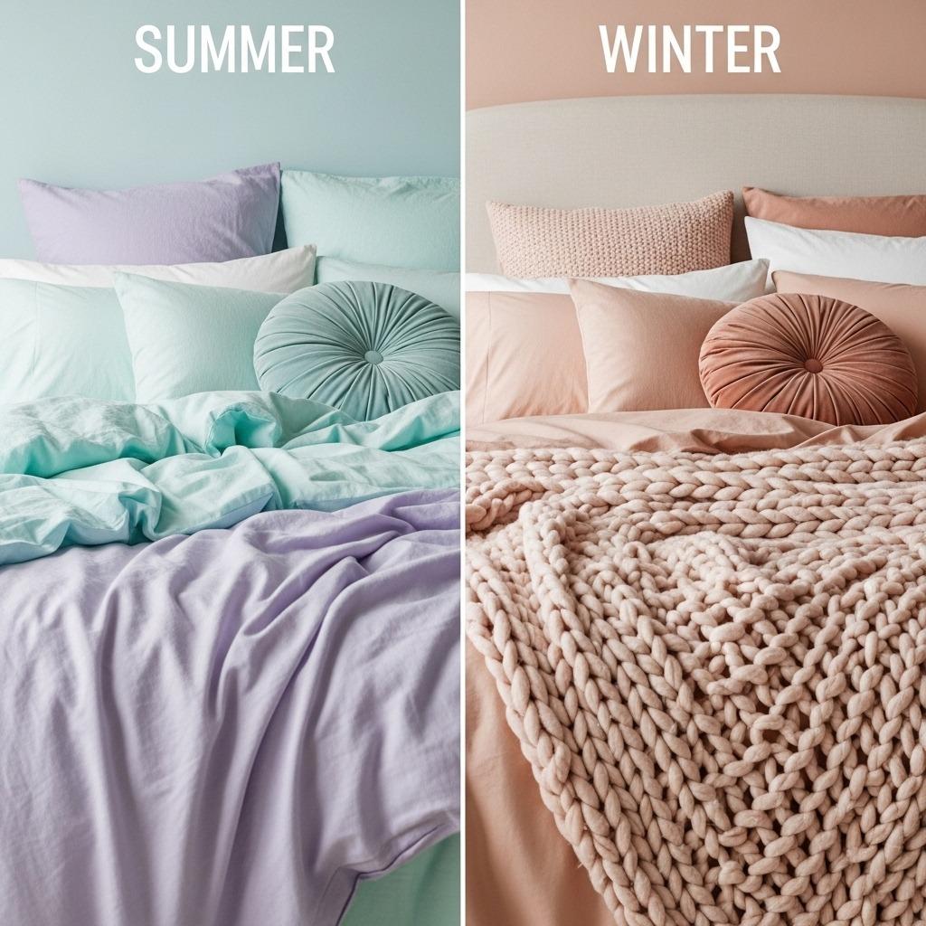 Fall and winter welcome warmer pastels – blush pink, peach, butter yellow, and soft coral. These colors feel cozier and more enveloping as temperatures drop. Layer in chunky knit throws, velvet pillows, and perhaps swap to heavier curtains. The same room shifts from fresh to cozy with relatively minimal effort.