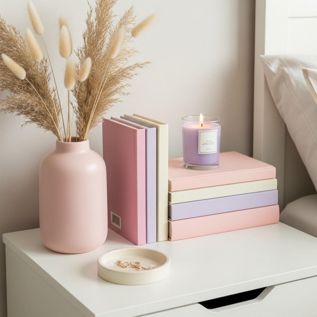 Group items in odd numbers for the most pleasing arrangements. Three pastel candles, five small vases, or a stack of three books feels more natural than pairs. Vary heights and shapes to create visual interest – a tall vase next to a short stack of books next to a medium-height frame.