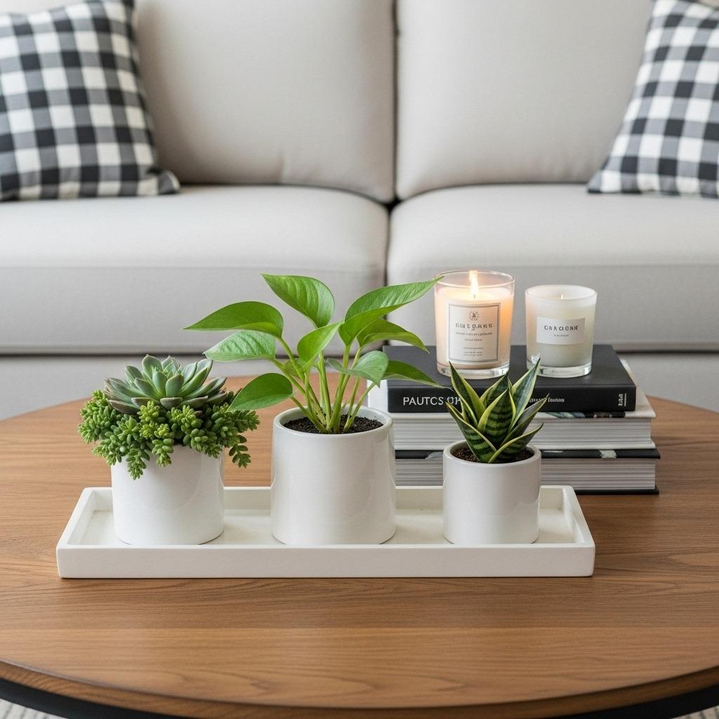 When styling plants on coffee tables or side tables, scale matters more than you think. A tiny succulent on a large coffee table looks lost and forgettable. Group three small plants together, or choose one medium-sized plant that can hold its own. Odd numbers always look more natural and intentional.