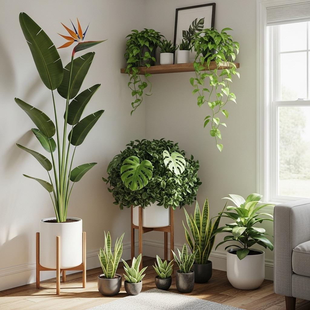 Start with a large floor plant as your anchor, then build around it with medium and small plants on stands or shelves. Layer them so each plant is visible and gets adequate light. This isn’t just about cramming plants together – it’s about creating a composition where each one has room to shine while contributing to the overall effect.
