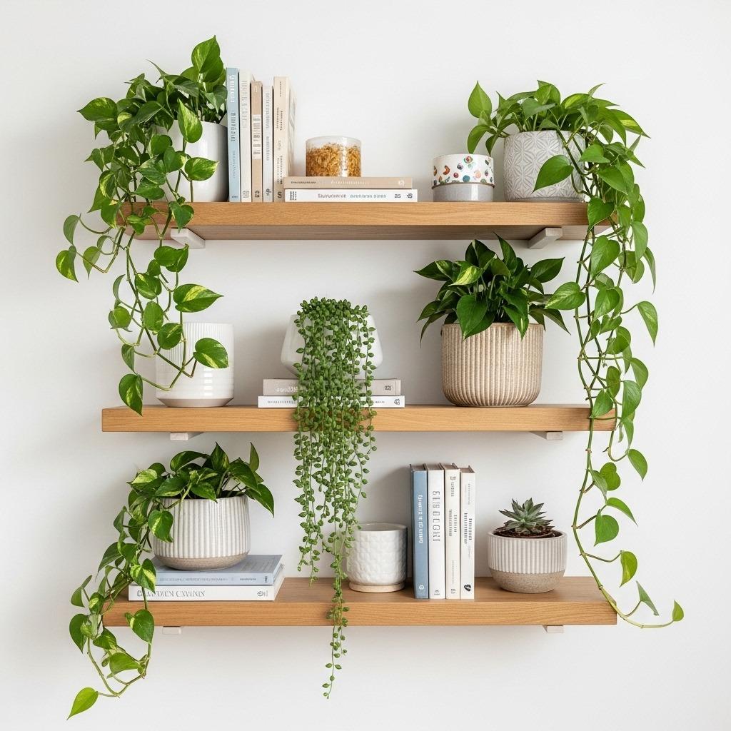 Shelves are prime real estate for trailing plants that can cascade down and create that coveted jungle vibe. Pothos, string of pearls, and philodendrons all love hanging out on high surfaces where their vines can do their thing. The movement they create adds life to static shelving.