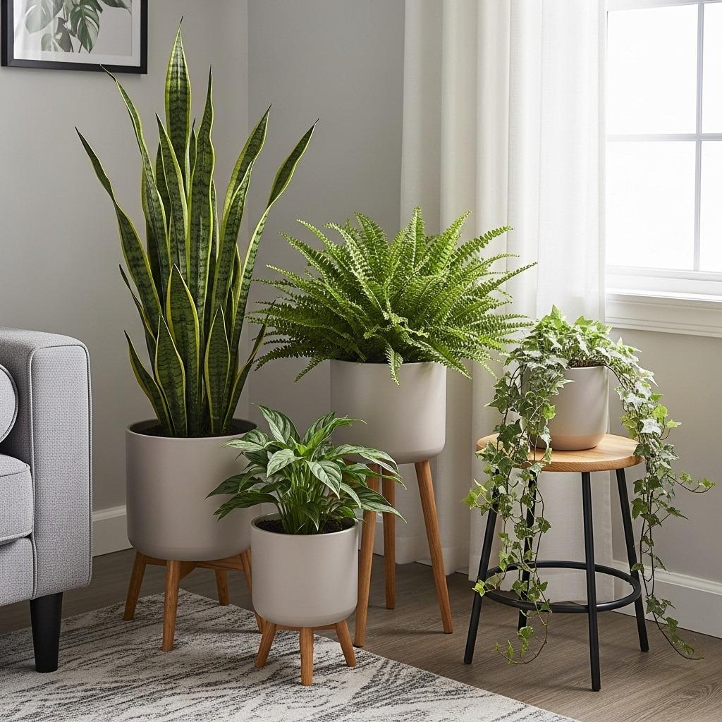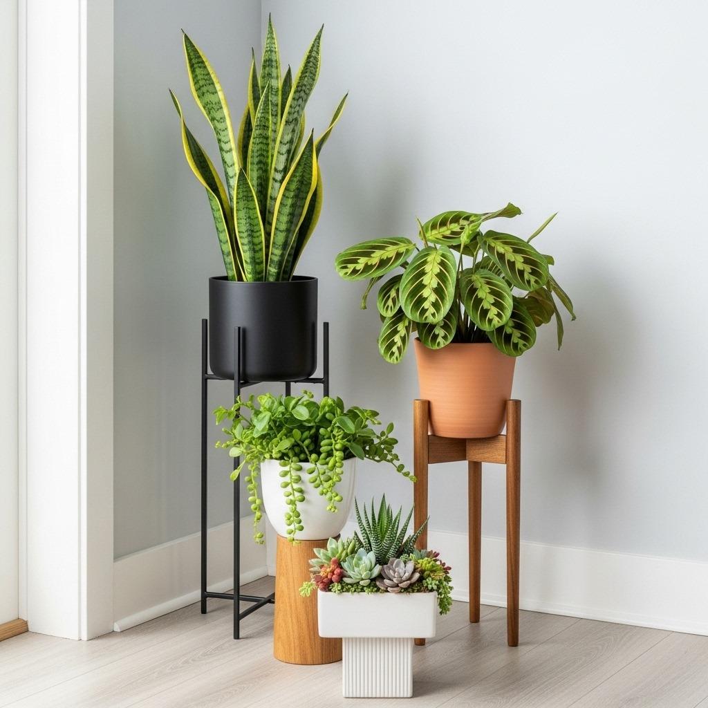 Cluster stands at different heights to create a mini plant corner that feels intentional. Three plants on stands of varying heights (think 10″, 16″, and 22″) creates more interest than three identical stands lined up. This staggered approach mimics how plants grow in nature and keeps your eye moving through the display.