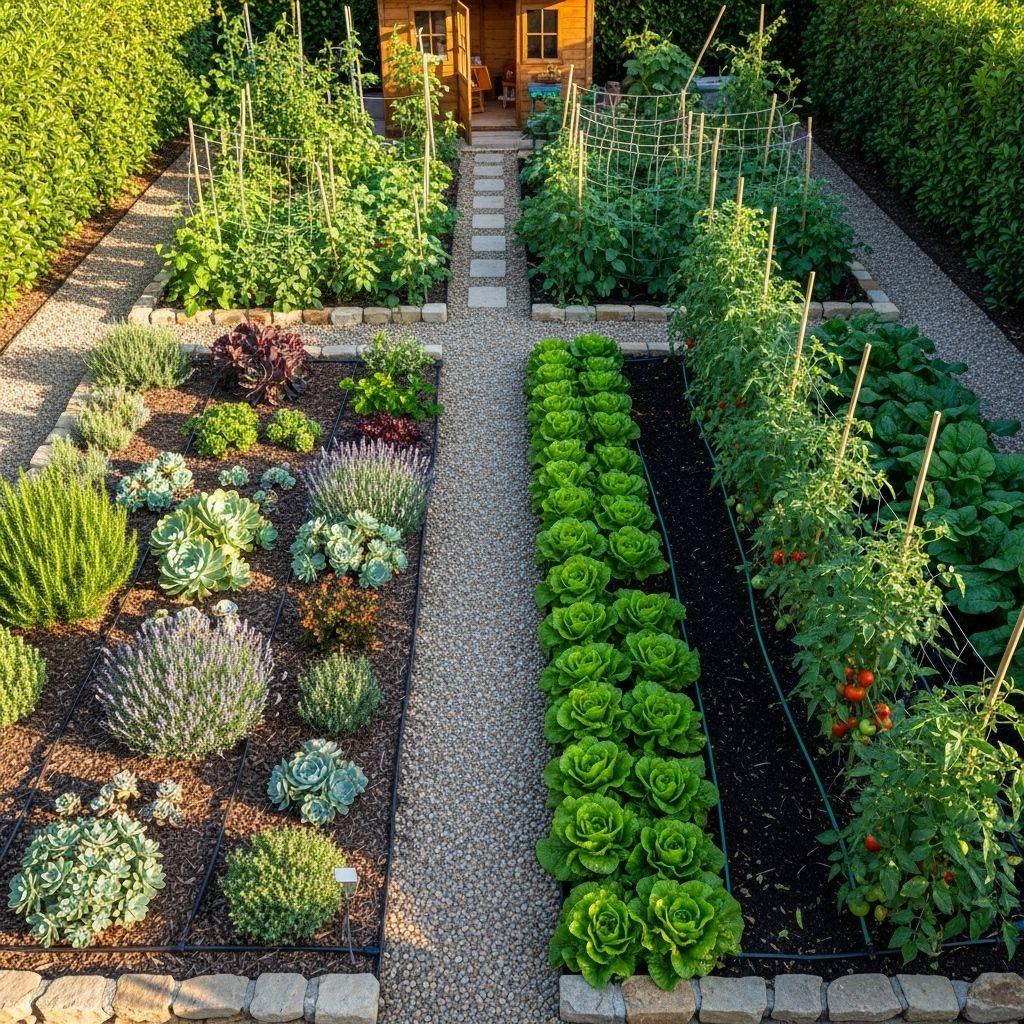 Vegetables and annual flowers that need consistent moisture go in one area with drip lines. Mediterranean herbs and native plants that prefer drier conditions get their own space with less frequent watering.