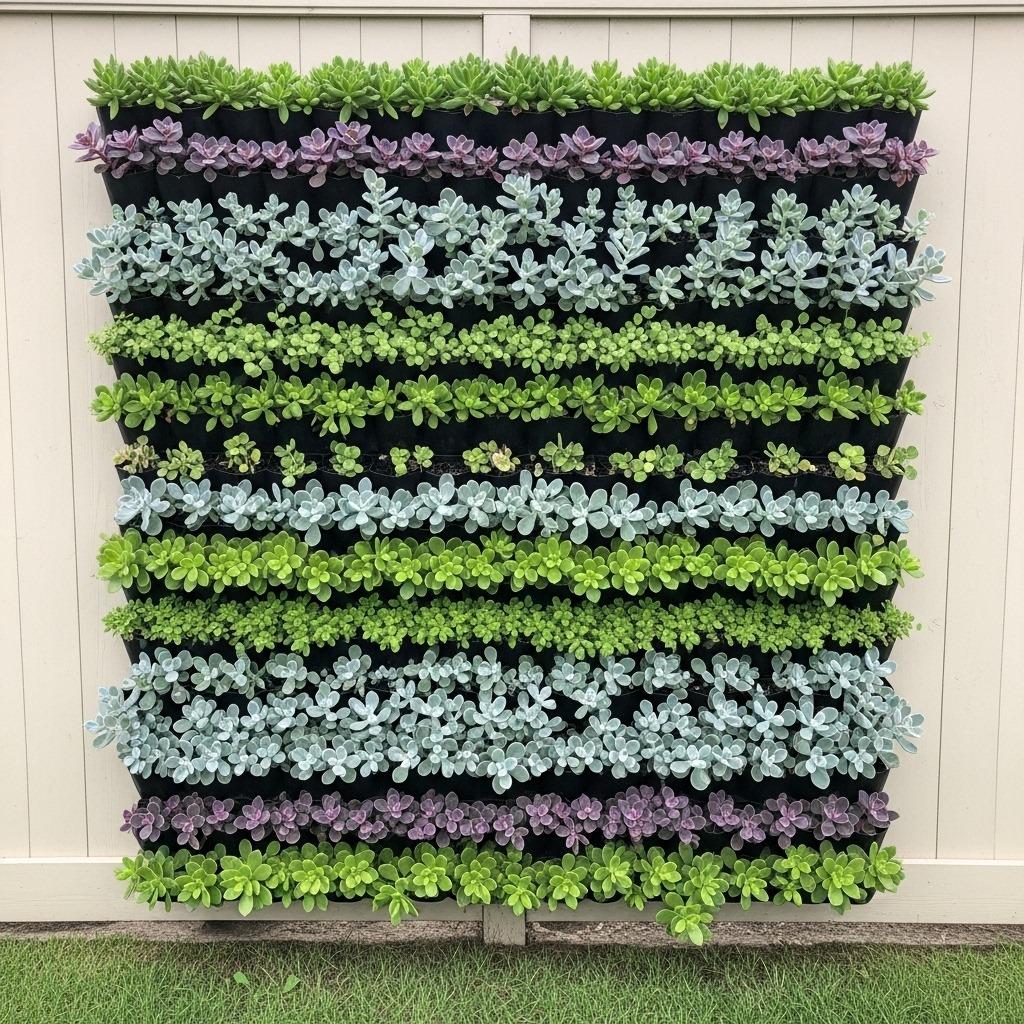 Pre-made vertical planters with individual pockets work well for this application. Plant each pocket with compact varieties like hens-and-chicks, sedum, or small echeveria that won’t outgrow their space quickly. The installation needs at least 4-6 hours of sunlight daily, and you’ll want to ensure water can drain freely from the bottom.