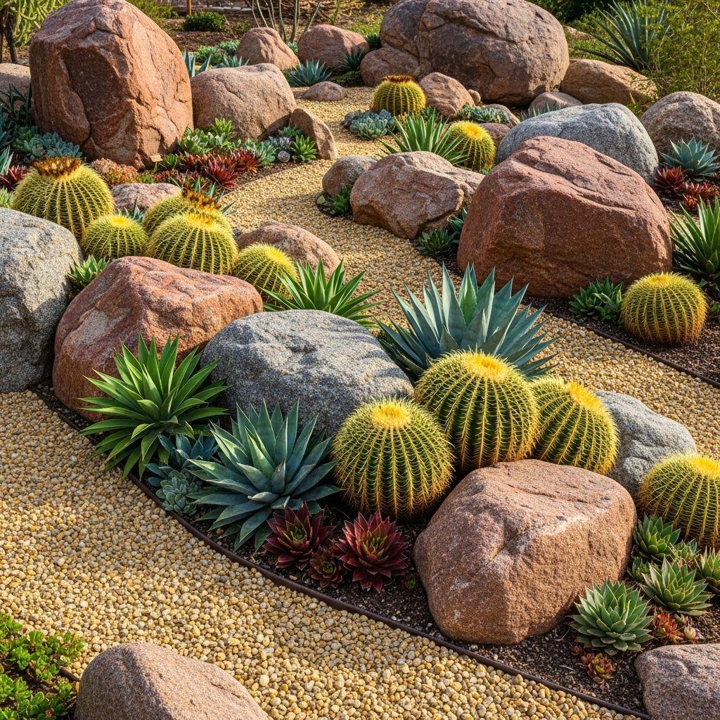 Combining succulents with decorative rocks creates a low-maintenance landscape that looks intentionally designed rather than sparse. Large boulders anchor the space visually, while smaller river rocks or decomposed granite fill gaps and prevent weed growth.