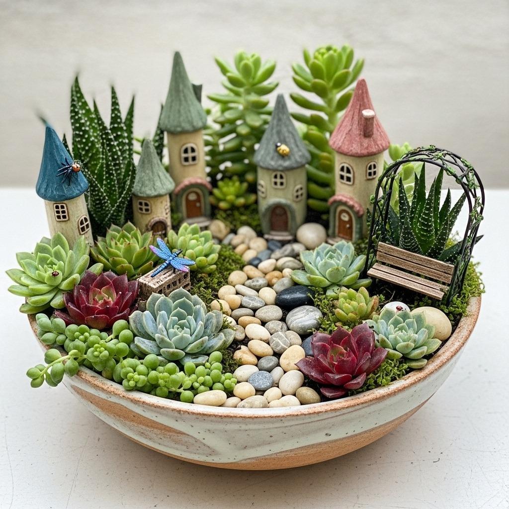 Layer the bottom with drainage material (small rocks or broken pottery pieces), add succulent soil, then create “zones” for different elements. Plant tiny succulents like baby toes or lithops, which naturally stay small and resemble miniature versions of larger plants. Add small decorative elements sparingly so plants remain the focus.