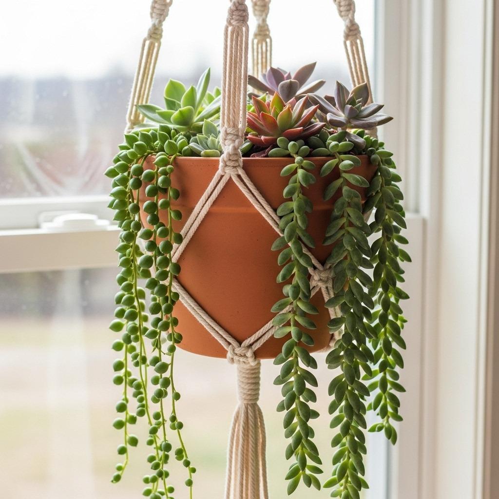 The key is using lightweight, well-draining soil since hanging planters can become heavy when wet. Water less frequently than you think necessary – overwatering is the number one killer of hanging succulents. When the trailing strands start looking slightly shriveled, it’s time for a drink.