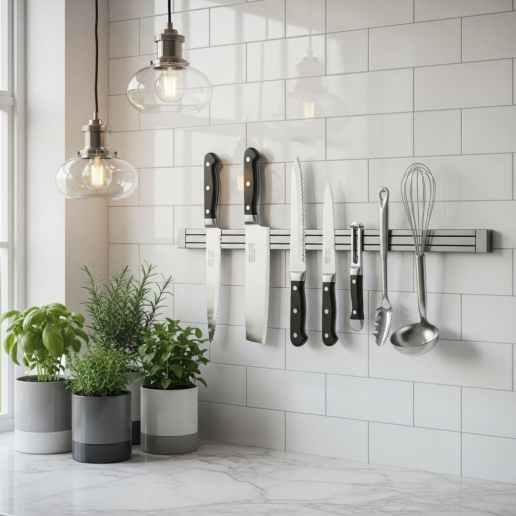 Forget bulky knife blocks that eat up precious counter real estate. A magnetic knife strip mounted on your wall or the side of a cabinet keeps your knives accessible, safe, and completely out of the way. This is one of those small kitchen tricks that seems obvious once you see it, but transforms how you think about storage.