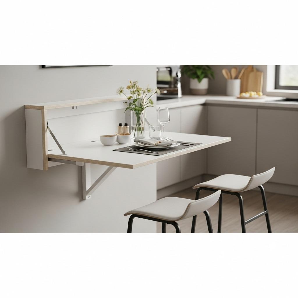 When floor space is limited, a wall-mounted fold-down table gives you a dining or prep surface that completely disappears when not in use. This is one of the smartest solutions for studio apartments or kitchens that flow into living areas.