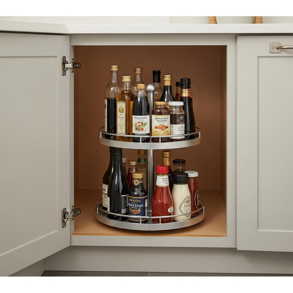 I use lazy susans in three places: upper cabinet for supplements and medications, lower cabinet for oils and vinegars, and under the sink for cleaning supplies. Everything becomes accessible without the frustration of moving ten things just to reach one bottle in the back. Two-tier versions maximize vertical space within the cabinet.
