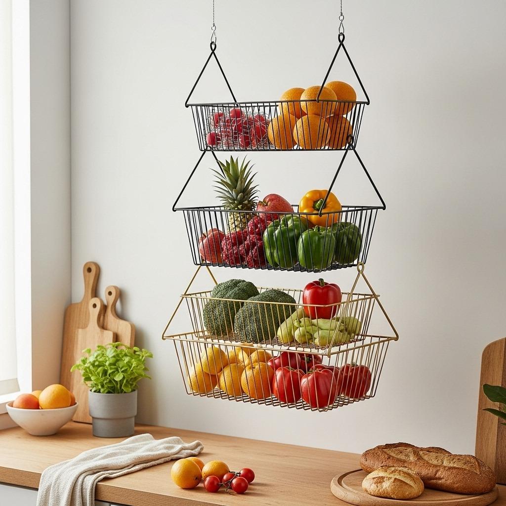 I switched to hanging baskets about six months ago and love having my fruit and vegetables visible yet out of the way. The different tiers naturally organize items by type or by how quickly they ripen. The airflow around hanging produce also helps it last longer than when piled in a bowl on the counter.