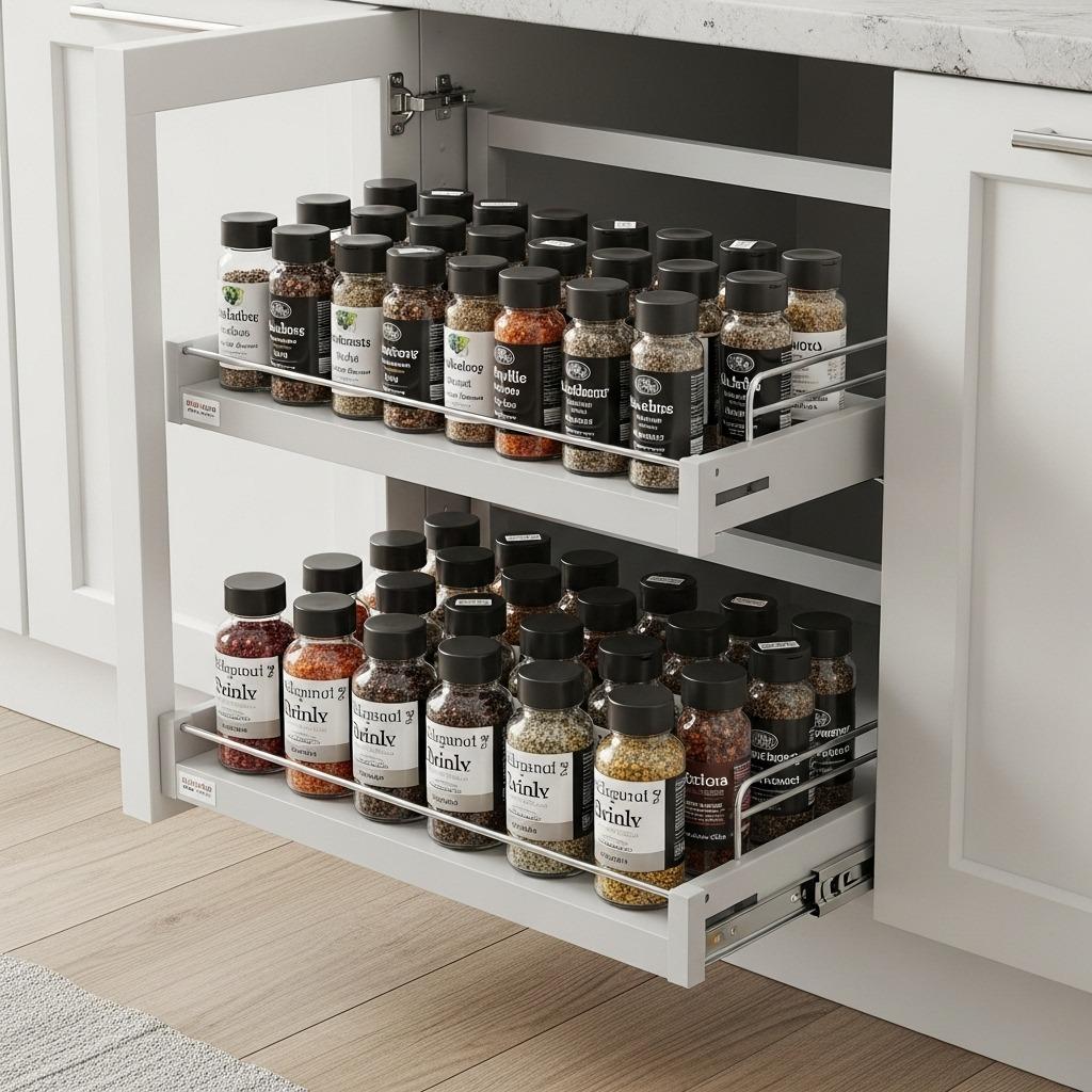 Standard cabinet shelves force you to dig around in the back for what you need. Slide-out organizers on glide rails bring everything forward with one pull. These are especially valuable for lower cabinets where you’d otherwise be crouching and reaching into dark corners.