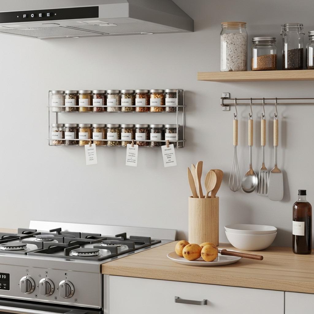 Consider the sunlight exposure when choosing a location, as direct sun can degrade spices faster. Also think about height and reach – you want this functional, not just decorative. If drilling isn’t an option, adhesive magnetic strips or hanging racks that use over-the-cabinet hooks can work as temporary solutions.