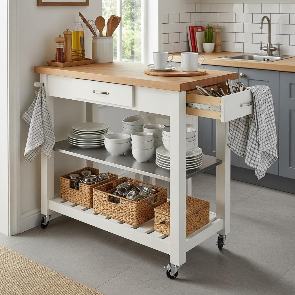 When counter space is at a premium, a rolling cart becomes your best friend. Think of it as a mobile kitchen island that you can move wherever you need it and tuck away when you don’t. This is efficient kitchen living at its finest.
