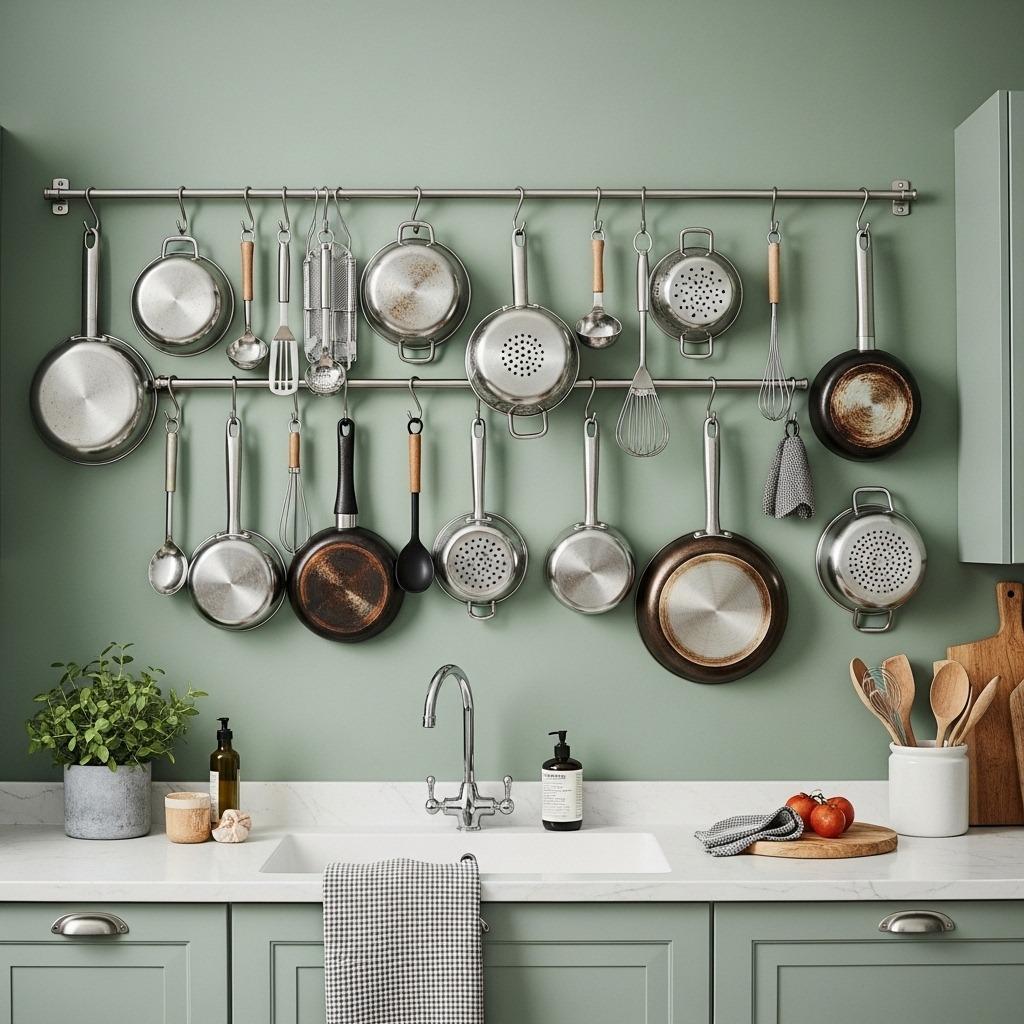 Your walls are probably the most underutilized space in your apartment kitchen. Installing a rail system, pegboard, or even just a series of hooks transforms vertical space into functional storage that’s actually easier to access than digging through cabinets.