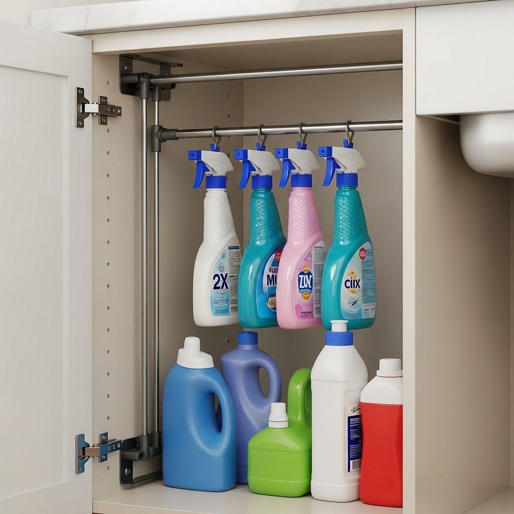 Install a tension rod vertically under your sink to hang spray bottles by their triggers. The bottles hang neatly, freeing up the cabinet floor for other supplies. You can also install rods horizontally to create dividers for baking sheets, cutting boards, or pot lids that otherwise just pile up messily.