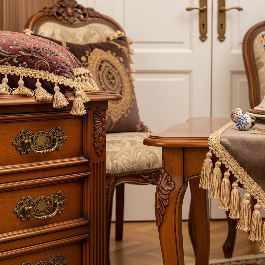 Trim and edging add finishing touches modern decor often skips. Tassels on pillows, fringe on throws, braided cord edging on upholstery – these details separate true vintage styling from rooms that just happen to include old furniture.