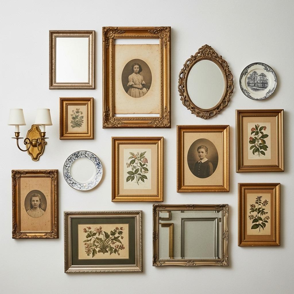 Walls offer prime real estate for vintage personality. Ornate frames holding botanical prints, family portraits, or even empty frames clustered together create that curated-over-generations look. Mix metals – brass, copper, silver – for added visual richness.