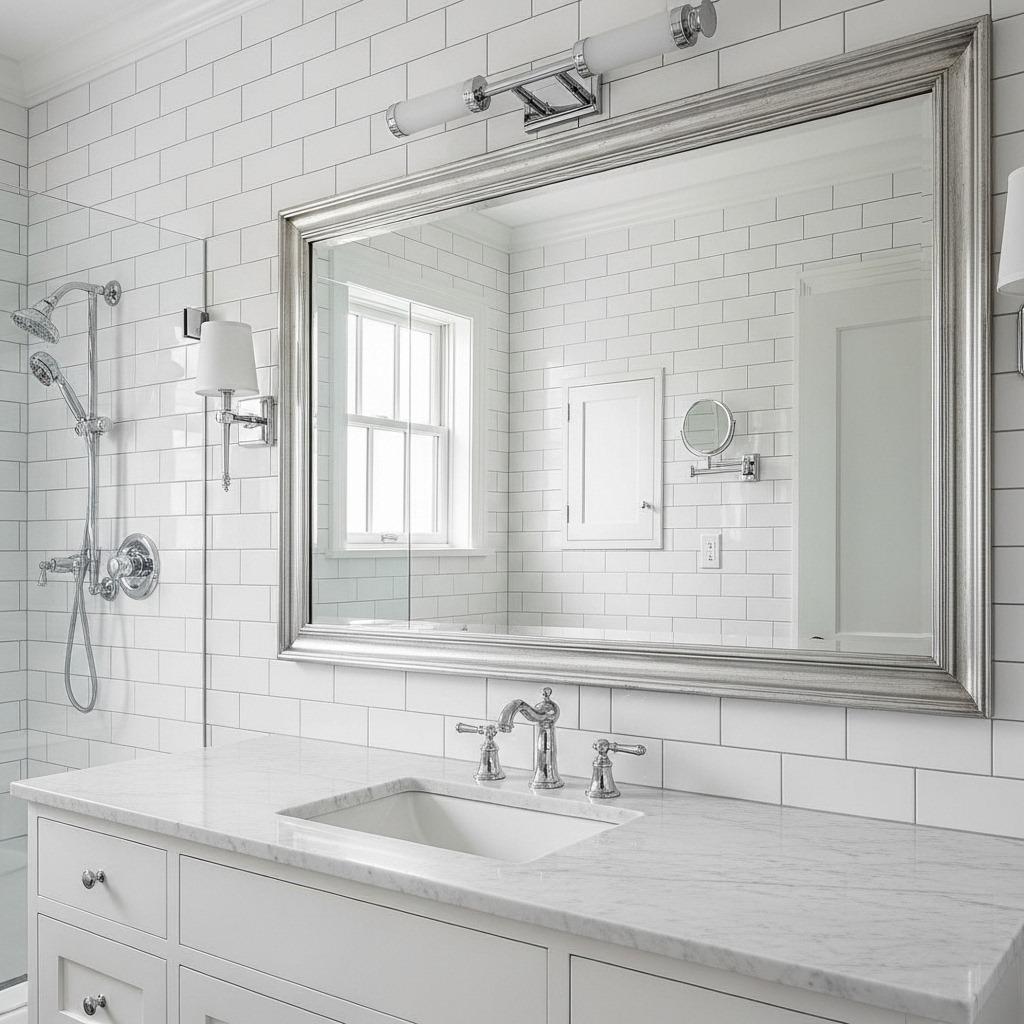 The surfaces in your bathroom play a huge role in how bright it feels. Light-colored materials reflect artificial light around the room, multiplying the effect of your fixtures. Think glossy white tiles, glass shower enclosures, polished chrome hardware, and light stone countertops.