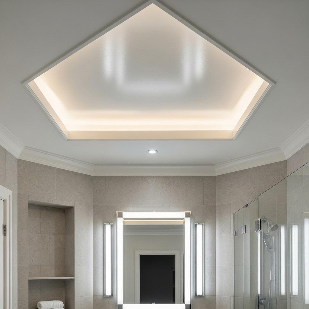 This technique is particularly effective in windowless bathrooms because it makes the ceiling appear to “glow,” giving the impression that light is coming from above naturally. The effect is subtle and sophisticated – think luxury spa rather than harsh office bathroom. It also makes ceilings appear higher, which helps counteract any claustrophobic feeling a windowless room might create.