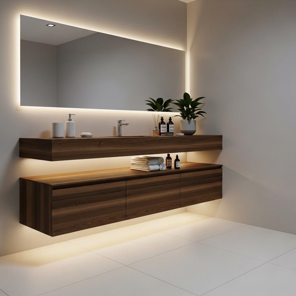 Ever stumbled into your bathroom in the middle of the night and been blinded by the overhead light? Toe-kick lighting solves this problem beautifully. These low-level lights mount under your cabinets at floor level, providing just enough illumination to navigate safely without disrupting your sleep.